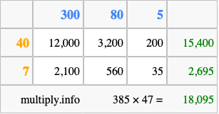 Finally, we add up all the sums we found in step 3 to get our final answer to 385 times 47.