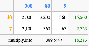 Finally, we add up all the sums we found in step 3 to get our final answer to 389 times 47.
