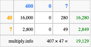 Finally, we add up all the sums we found in step 3 to get our final answer to 407 times 47.