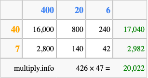 That's all there is to it! As you can see from the box above, the answer to 426 times 47 using the box method is 20,022.