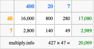 Finally, we add up all the sums we found in step 3 to get our final answer to 427 times 47.