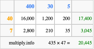 Finally, we add up all the sums we found in step 3 to get our final answer to 435 times 47.