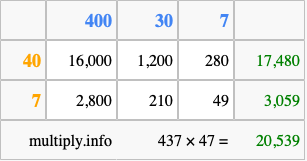 That's all there is to it! As you can see from the box above, the answer to 437 times 47 using the box method is 20,539.