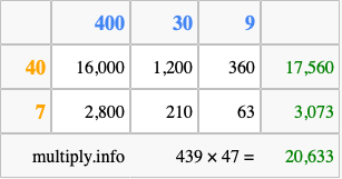 Finally, we add up all the sums we found in step 3 to get our final answer to 439 times 47.
