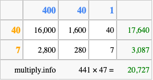 That's all there is to it! As you can see from the box above, the answer to 441 times 47 using the box method is 20,727.