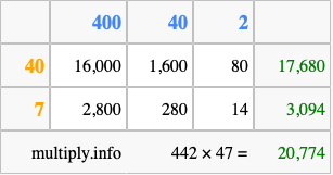 Finally, we add up all the sums we found in step 3 to get our final answer to 442 times 47.
