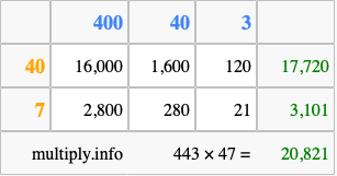 Finally, we add up all the sums we found in step 3 to get our final answer to 443 times 47.