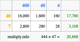 Finally, we add up all the sums we found in step 3 to get our final answer to 444 times 47.