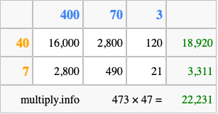 That's all there is to it! As you can see from the box above, the answer to 473 times 47 using the box method is 22,231.