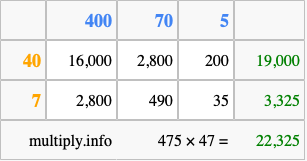 That's all there is to it! As you can see from the box above, the answer to 475 times 47 using the box method is 22,325.