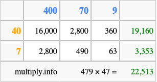 That's all there is to it! As you can see from the box above, the answer to 479 times 47 using the box method is 22,513.