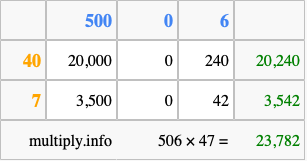 That's all there is to it! As you can see from the box above, the answer to 506 times 47 using the box method is 23,782.