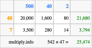 That's all there is to it! As you can see from the box above, the answer to 542 times 47 using the box method is 25,474.