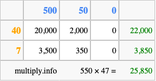 Below is an illustration showing you how to calculate 550 times 47 using the box method, using the instructions above.