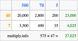 Below is an illustration showing you how to calculate 575 times 47 using the box method, using the instructions above.