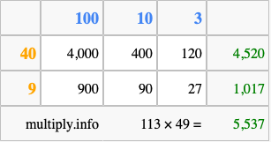 That's all there is to it! As you can see from the box above, the answer to 113 times 49 using the box method is 5,537.