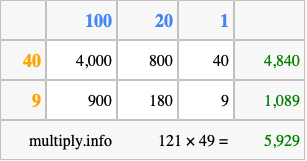 Finally, we add up all the sums we found in step 3 to get our final answer to 121 times 49.