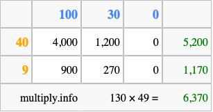 Below is an illustration showing you how to calculate 130 times 49 using the box method, using the instructions above.
