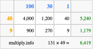 That's all there is to it! As you can see from the box above, the answer to 131 times 49 using the box method is 6,419.