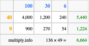 That's all there is to it! As you can see from the box above, the answer to 136 times 49 using the box method is 6,664.