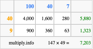 Finally, we add up all the sums we found in step 3 to get our final answer to 147 times 49.