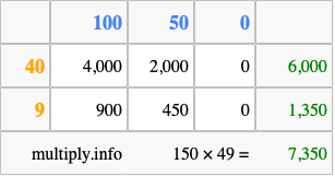 Below is an illustration showing you how to calculate 150 times 49 using the box method, using the instructions above.