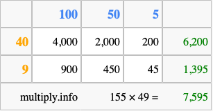 Finally, we add up all the sums we found in step 3 to get our final answer to 155 times 49.