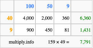 That's all there is to it! As you can see from the box above, the answer to 159 times 49 using the box method is 7,791.