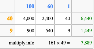 That's all there is to it! As you can see from the box above, the answer to 161 times 49 using the box method is 7,889.