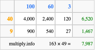 That's all there is to it! As you can see from the box above, the answer to 163 times 49 using the box method is 7,987.