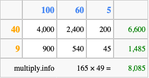 Below is an illustration showing you how to calculate 165 times 49 using the box method, using the instructions above.