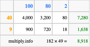 That's all there is to it! As you can see from the box above, the answer to 182 times 49 using the box method is 8,918.