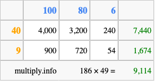 Finally, we add up all the sums we found in step 3 to get our final answer to 186 times 49.