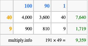 That's all there is to it! As you can see from the box above, the answer to 191 times 49 using the box method is 9,359.