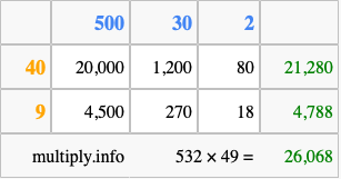 That's all there is to it! As you can see from the box above, the answer to 532 times 49 using the box method is 26,068.