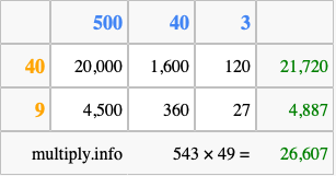 Finally, we add up all the sums we found in step 3 to get our final answer to 543 times 49.