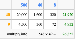 Finally, we add up all the sums we found in step 3 to get our final answer to 548 times 49.
