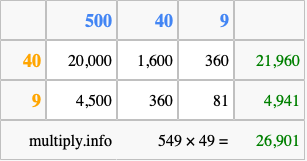 That's all there is to it! As you can see from the box above, the answer to 549 times 49 using the box method is 26,901.