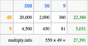 Finally, we add up all the sums we found in step 3 to get our final answer to 559 times 49.