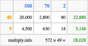 Finally, we add up all the sums we found in step 3 to get our final answer to 572 times 49.