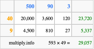 That's all there is to it! As you can see from the box above, the answer to 593 times 49 using the box method is 29,057.