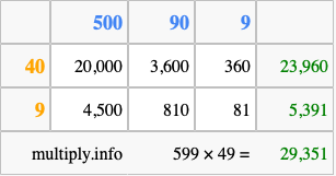 Below is an illustration showing you how to calculate 599 times 49 using the box method, using the instructions above.