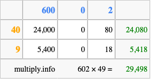 That's all there is to it! As you can see from the box above, the answer to 602 times 49 using the box method is 29,498.