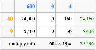 That's all there is to it! As you can see from the box above, the answer to 604 times 49 using the box method is 29,596.