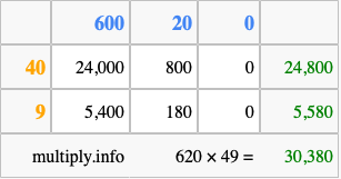 That's all there is to it! As you can see from the box above, the answer to 620 times 49 using the box method is 30,380.
