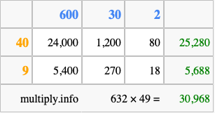 That's all there is to it! As you can see from the box above, the answer to 632 times 49 using the box method is 30,968.
