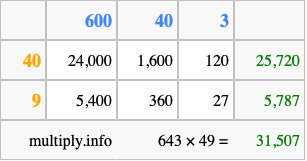 Finally, we add up all the sums we found in step 3 to get our final answer to 643 times 49.