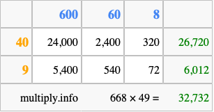 That's all there is to it! As you can see from the box above, the answer to 668 times 49 using the box method is 32,732.