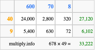 That's all there is to it! As you can see from the box above, the answer to 678 times 49 using the box method is 33,222.