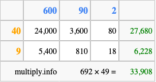 That's all there is to it! As you can see from the box above, the answer to 692 times 49 using the box method is 33,908.